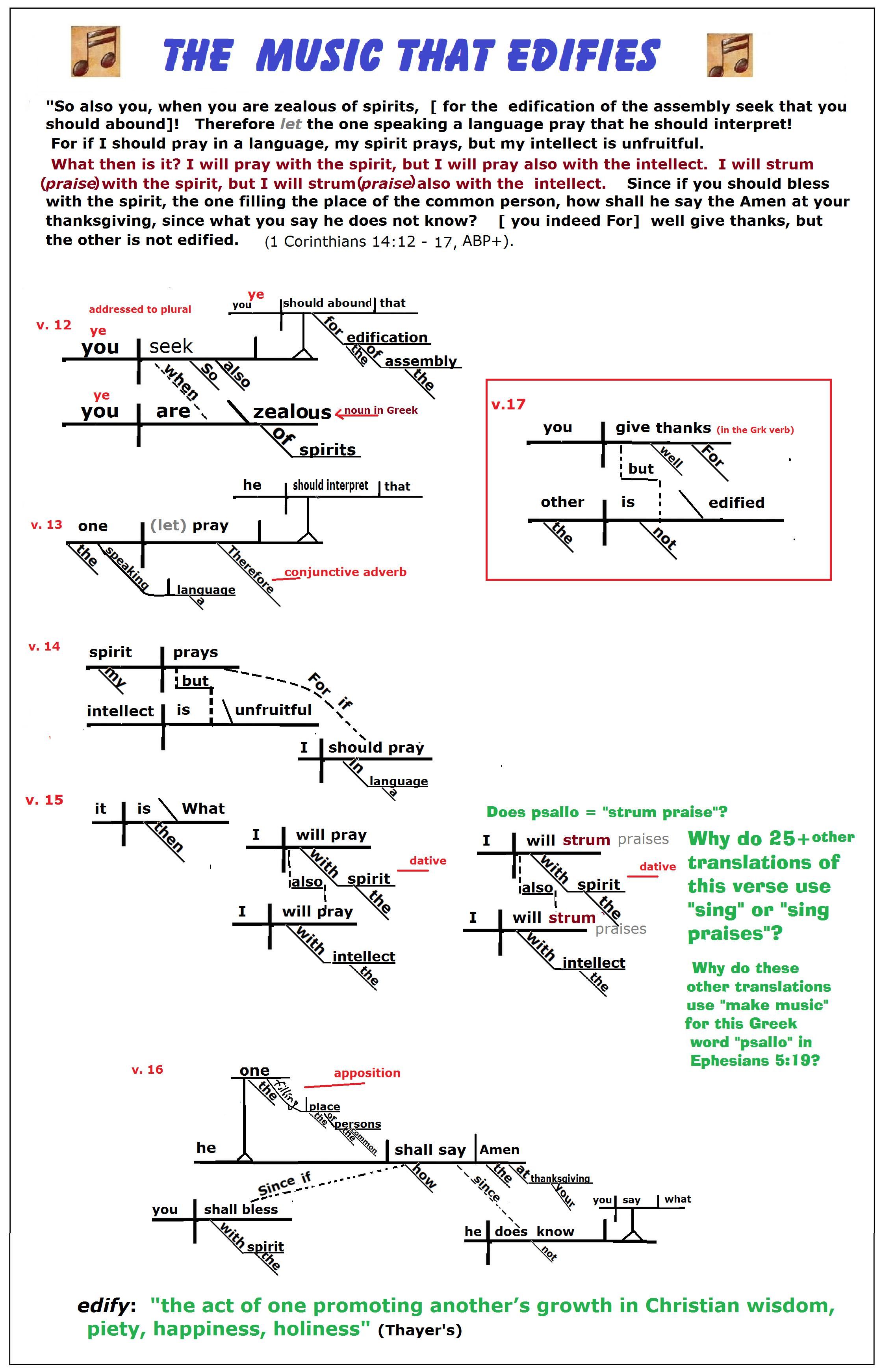 "Making Music" [PSALLO (ψάλλωG5567)]. It is interesting that the translations, including the KJV, that translate "psallo" as "making melody" in Ephesians 5:19 translate this same word "psallo" in 1 Corinthians 14:15 as "sing" or "sing psalms" or "sing praises."v The "making melody" or our ABP+ translation's "strum" according to 1 Corinthians 14:15 requires an understandable use of the human language and no musical instrument can do that. The singing must be voiced from the Lord's approved "revelation, or knowledge, or prophesying, or doctrine." All witnesses that we have considered in this series, 1 Corinthians 14:13, Ephesians 5:19 and Colossians 3:16 require that we must use as source for our singing the Scriptures, i.e., the "Word of Christ" and the "Will of the Lord" so that the congregation is edified. That is, to be Scriptural and "doing all things in the name" (authority) "of Jesus", we must promote "one another’s growth in Christian wisdom, piety, happiness, holiness." This cannot be obeyed with a musical instrument which at the most can convey meaning of only carnal things, a battle and not spiritual (and mental spiritual warfare) information (1 Corinthians 14:8).