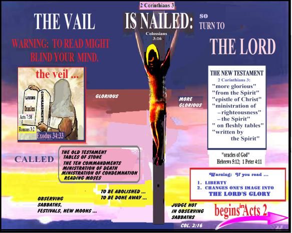 "But if the ministration of death, written and engraven in stones, was glorious, so that the children of Israel could not stedfastly behold the face of Moses for the glory of his countenance; which glory was to be done away. ... And not as Moses, which put a vail over his face, that the children of Israel could not stedfastly look to the end of that which is abolished: But their minds were blinded: for until this day remaineth the same vail untaken away in the reading of the old testament; which vail is done away in Christ. But even unto this day, when Moses is read, the vail is upon their heart. Nevertheless when it shall turn to the Lord, the vail shall be taken away" (2 Corinthians 3:7, 13-16, my emphasis).